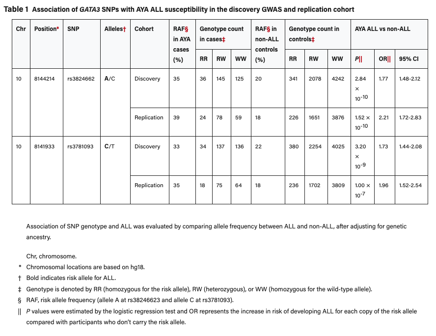 c. In het artikel worden 2 SNP’s gepresenteerd (uit een set van 635297 SNP’s) die significant samenhangen met ALL in de AYA group. In tabel 1 (hieronder nogmaals weergegeven) staan de gegevens van deze SNP’s samengevat.
