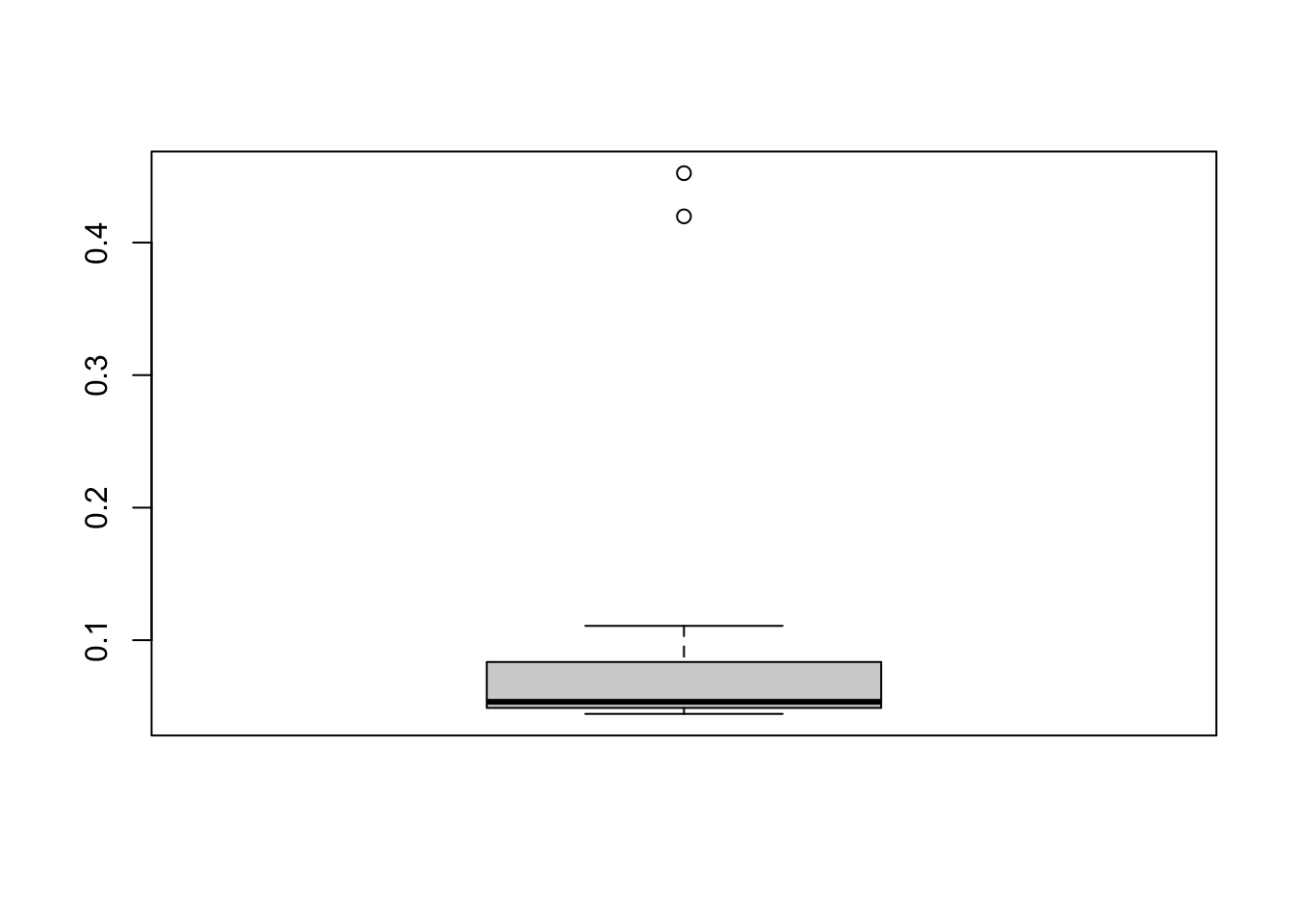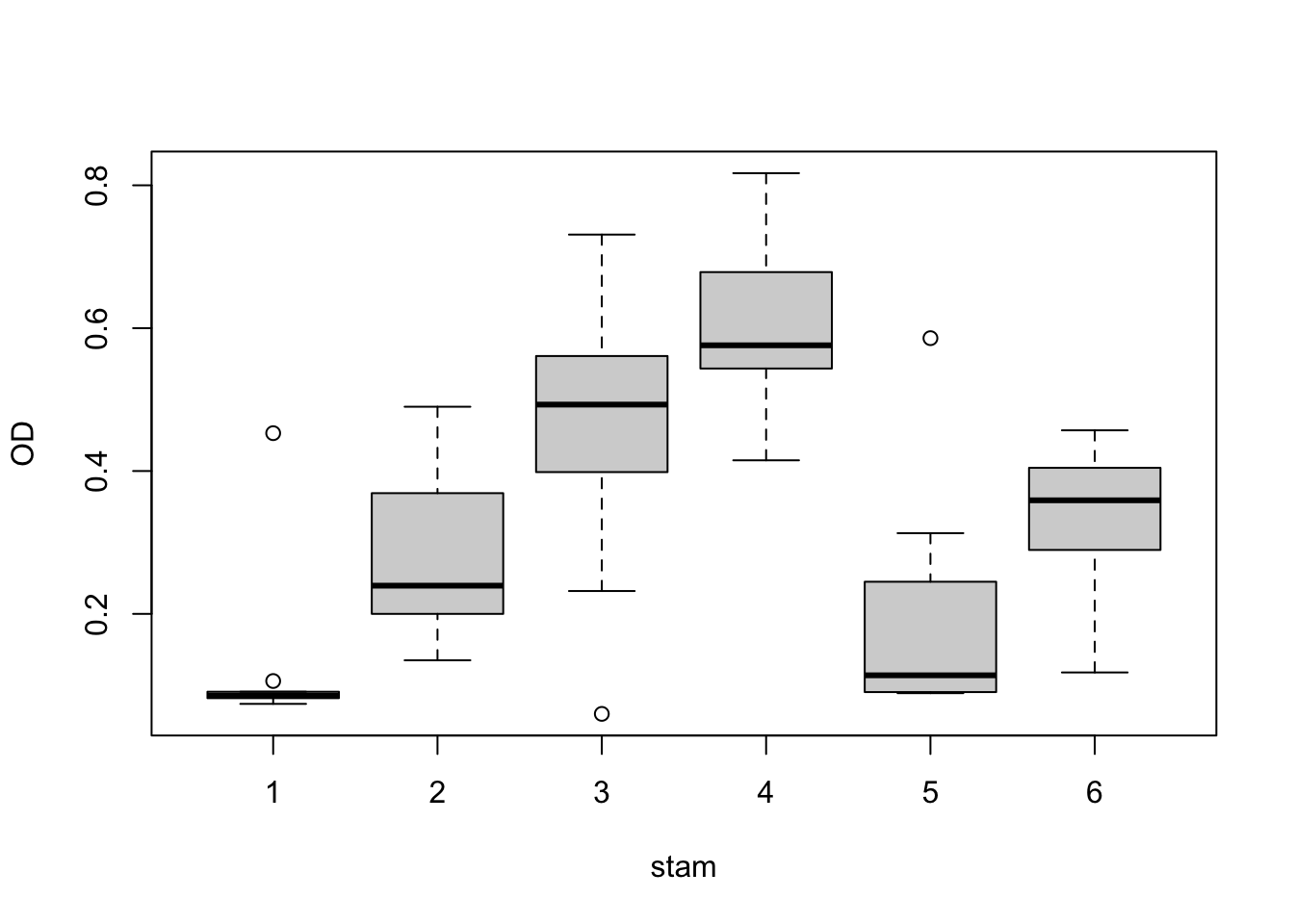 boxplot(OD250~ stam, data = d1, xlab="stam", ylab="OD")