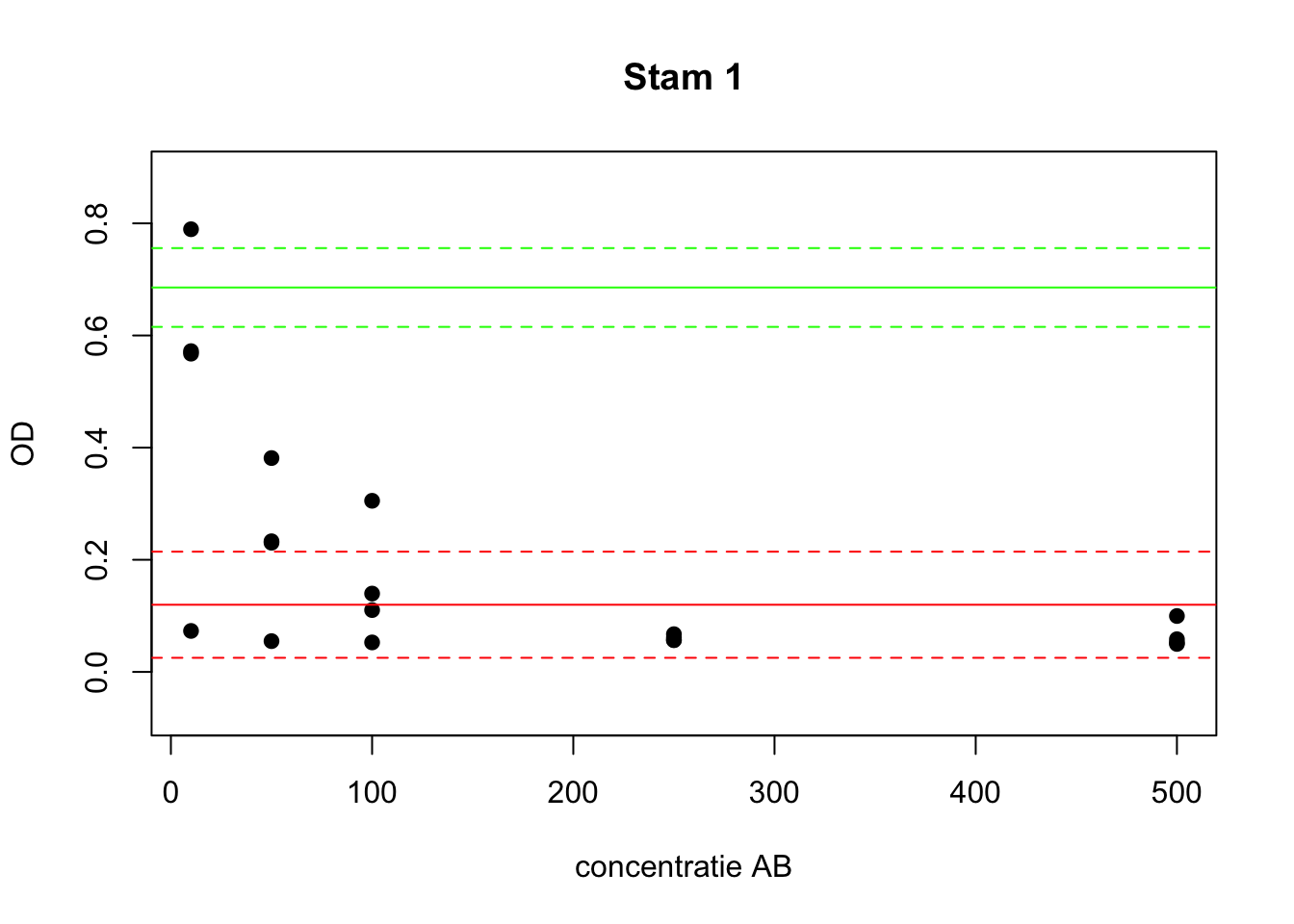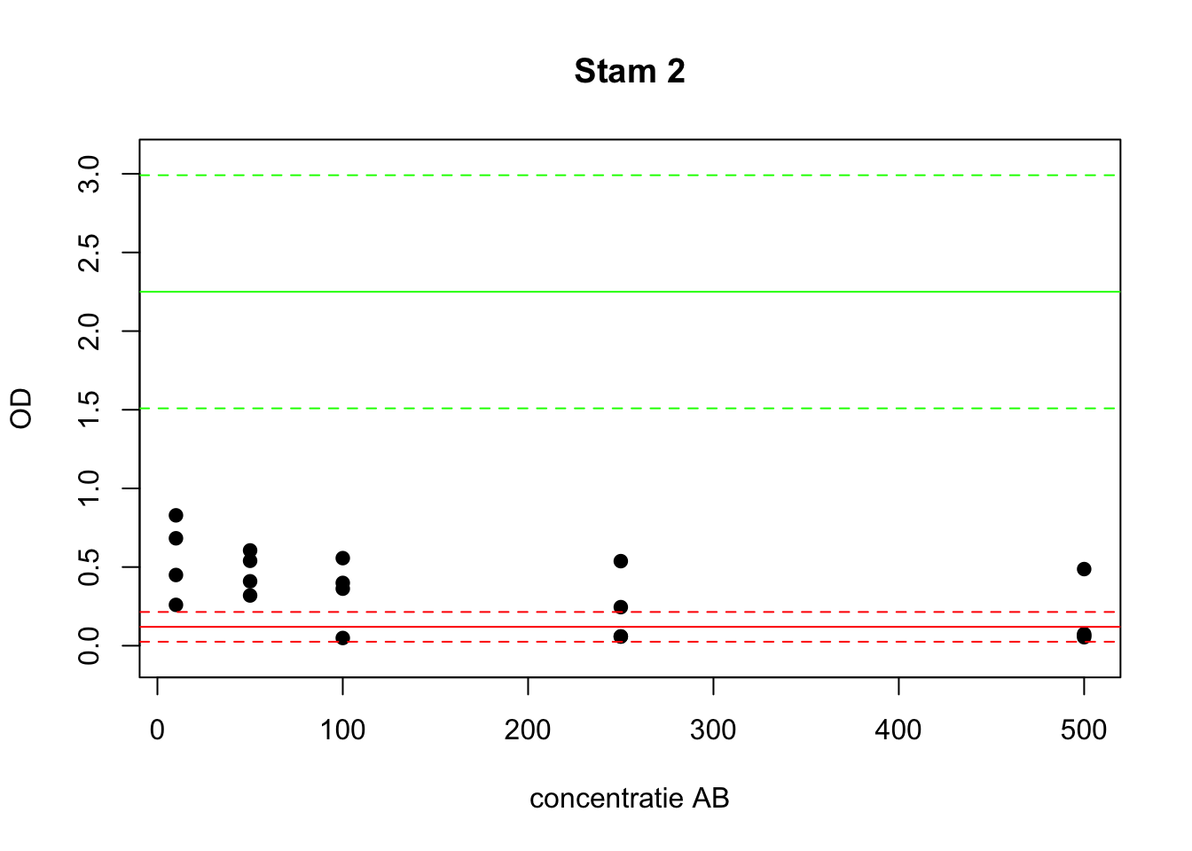 Bij stam 2 zien we dat er een grote spreiding is in de 3 waarden per concentratie AB. Er is misschien een dalende trend, want bij de laagste concentratie zijn er al lagere OD waardes die onder de ondergrens van de positieve controles vallen, maar daarna is er een nauwelijks een dalende trend in OD.De waardes komen niet consequent onder de bovengrens van de negatieve controles en daarom is het moeilijk om een goede conclusie te trekken.