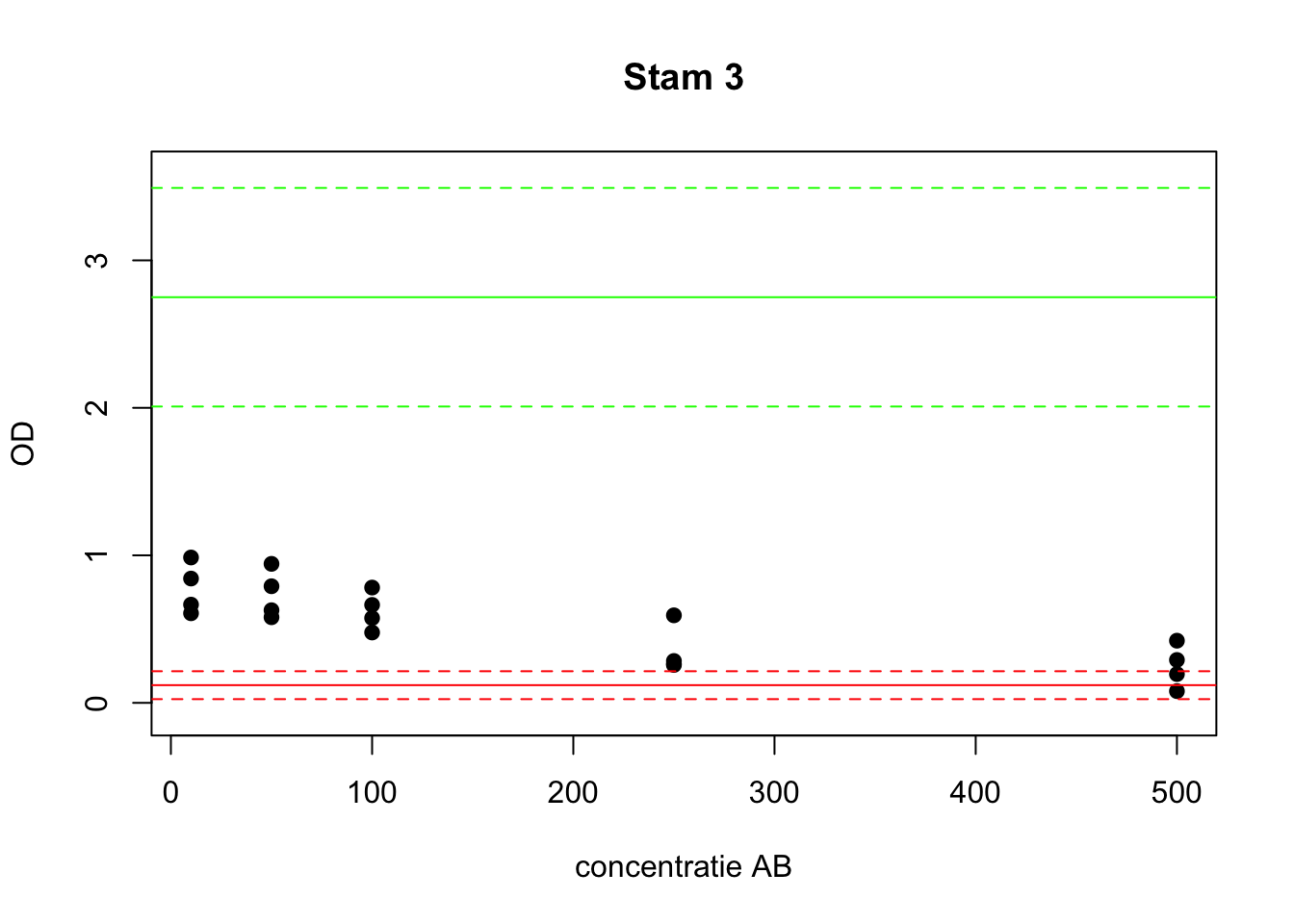 Bij stam 3 zien we weer een duidelijkere dalende trend in OD. Wel zien we dat er bij bijna alle concentraties een OD is die hoger is dan de bovengrens van het 95% BHI, behalve bij de hoogste concentratie AB. We concluderen dat er pas bij een hoge concentratie AB groeiremming is; stam 3 is matig gevoelig voor dit AB.