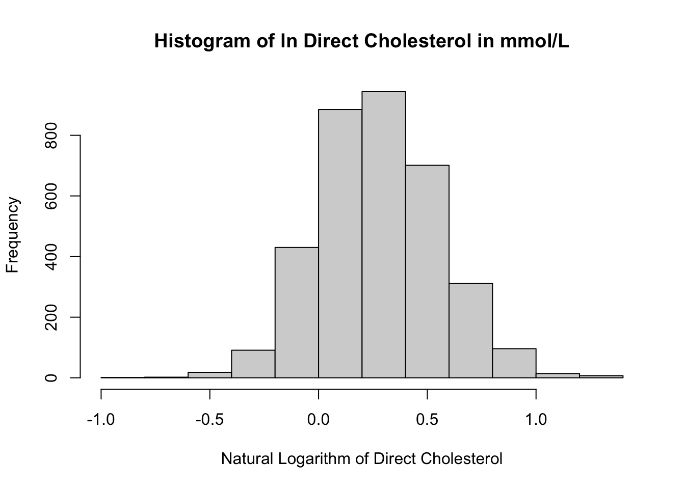 In de NHANES dataset is HDL cholesterol gegeven in mmol/L. Dit is in veel landen de standaard eenheid van HDL cholesterol, in tegenstelling tot de VS. Daar wordt de eenheid mg/dL gebruikt, hiervoor is de conversie factor om van mmol/L naar mg/dL te transformeren 38.61004.