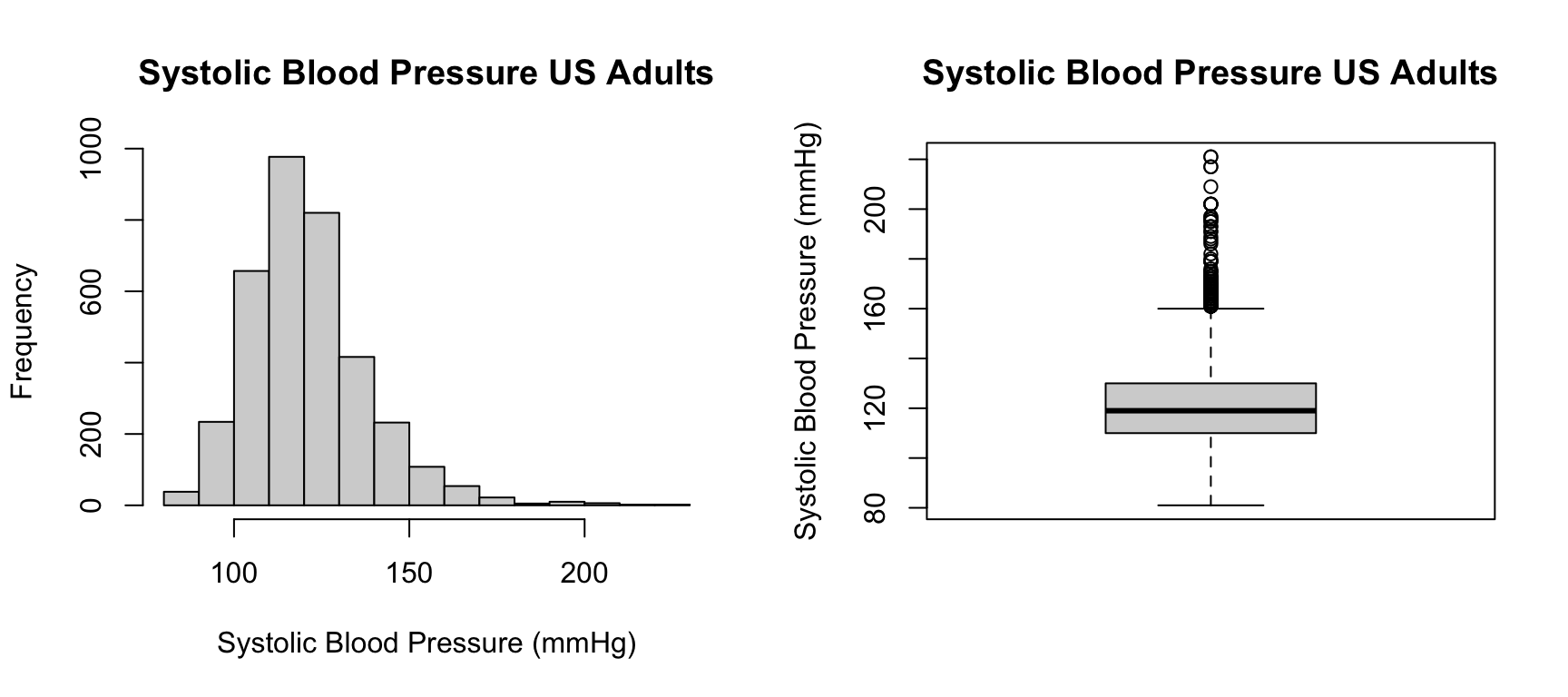 Probeer de mediaan van SBP in de steekproef af te lezen. Wat zijn de eerste en derde kwartielen, en wat is de interkwartielafstand? Kun je schatten wat het gemiddelde en de standaarddeviatie zijn? Doe dit eerst zelf en vergelijk je antwoorden vervolgens met je groep.