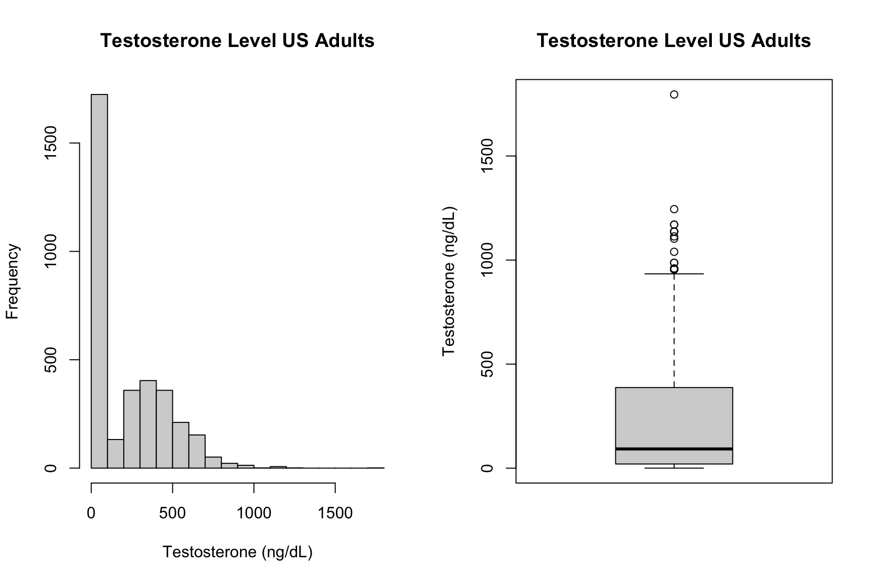 Nu kijken we naar de verdeling van testosteron in de steekproef. Hieronder staan de histogram en boxplot van testosteron weergegeven.