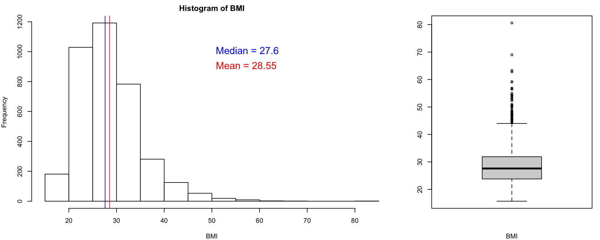 Een arts werkt in een praktijk in de wijk Woensel-west in Eindhoven, een van de zogenoemde Vogelaarwijken. Zij vermoedt dat er veel overgewicht is in haar gebied, en ze heeft daarom een steekproef genomen uit haar patiëntenbestand om dit te onderzoeken. Onderstaande histogram en boxplot geven een overzicht van deze data. Raden jullie haar aan om het gemiddelde of de mediaan te rapporteren in haar verslag? Ga goed na wat de voor- en nadelen van deze beide centrummaten zijn, en maak dan een keuze.