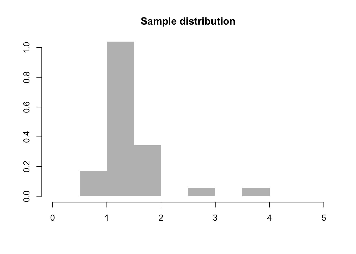 Je bent gevraagd om data-analyse uit te voeren voor een presentatie op een studentencongres. Je onderzoekt serum miRNA expressie in 3 cellijnen m.b.v. TaqMan kwantitatieve PCR. Je eerste blik op de data van de eerste cellijn levert het histogram hiernaast op. Twee vrij hoge metingen vallen je op. Je checkt meteen of er fouten zijn gerapporteerd in het logboek, en je vraagt dit ook nog na, maar je vindt geen duidelijke reden voor deze afwijkingen. Wat doe je? Ga je deze uitbijters verwijderen uit je dataset, of laat je ze erin?
