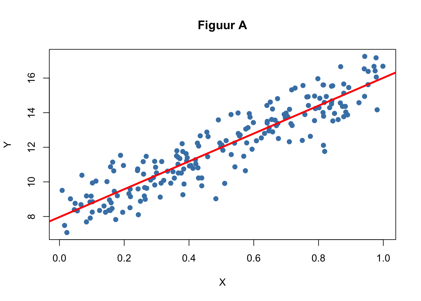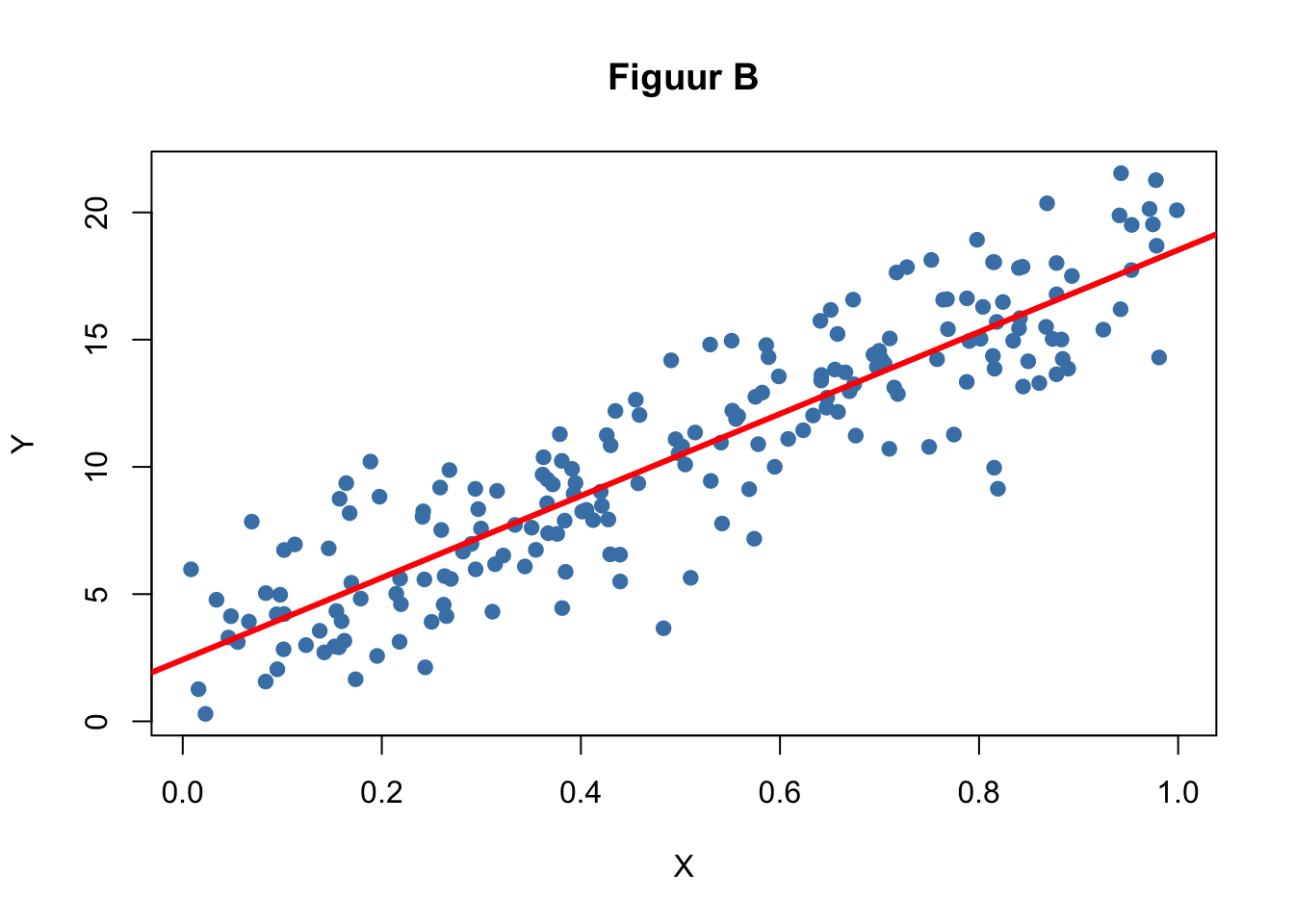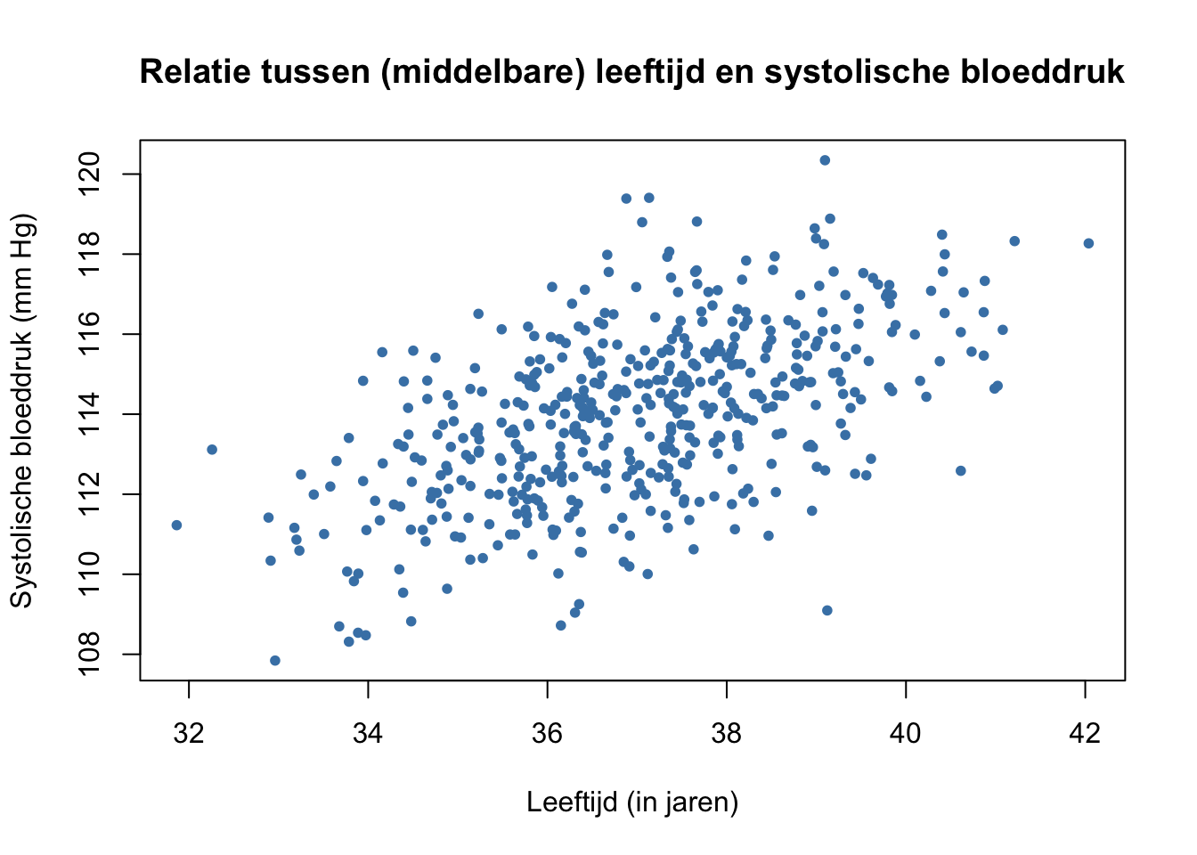 Onderzoekers zijn geïnteresseerd naar invloed van leeftijd op systolische bloeddruk. De interesse gaat in het bijzonder uit naar mannen tussen de 32 en de 42 jaar, aangezien uit eerder onderzoek is gebleken dat deze groep een verhoogd risico heeft op een te hoge systolische bloeddruk. De onderzoekers hebben daarom besloten een (random) steekproef te trekken van mannen in deze leeftijdsgroep en hebben voor iedere man de leeftijd en het gemiddelde van drie metingen van de systolische bloeddruk genoteerd. Deze observaties hebben ze vervolgens afgebeeld in een scatterplot (figuur 6).