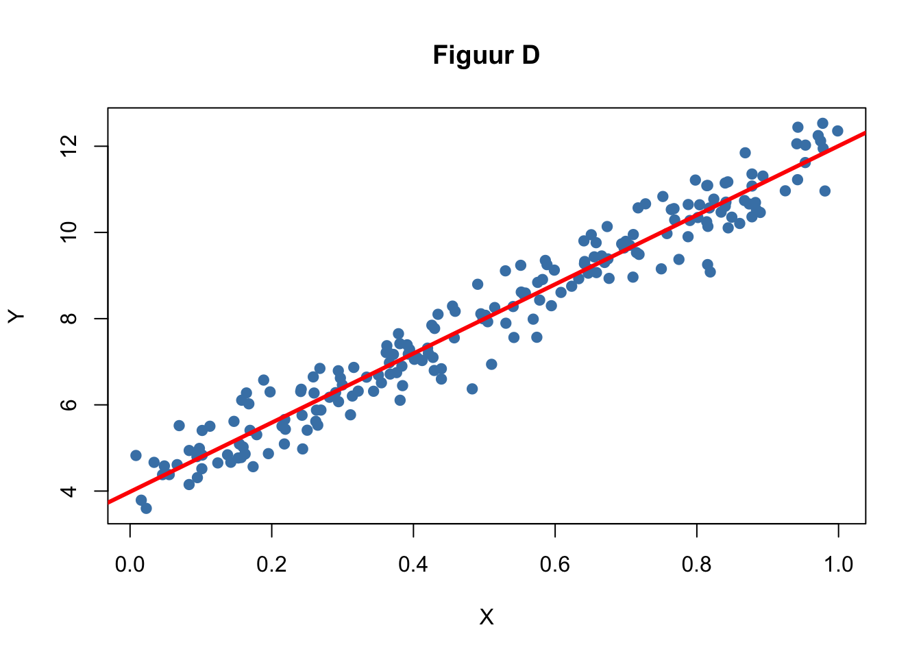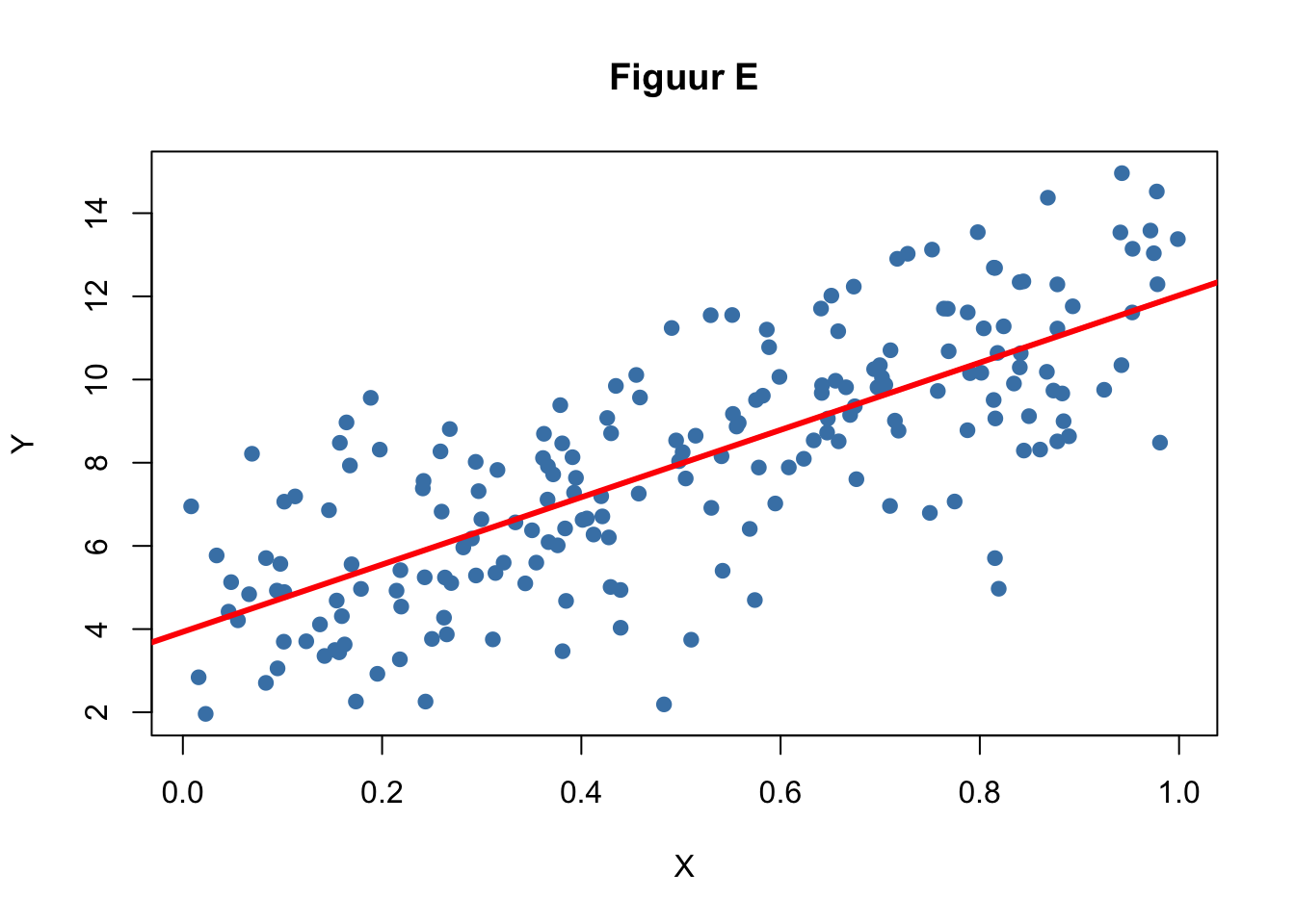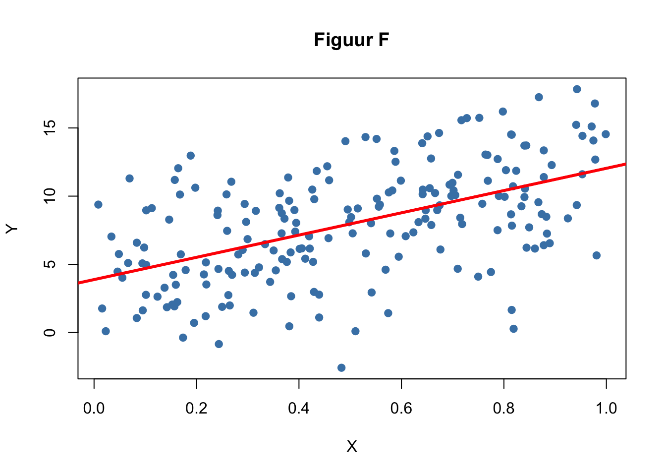 Onderzoekers zijn geïnteresseerd naar invloed van leeftijd op systolische bloeddruk. De interesse gaat in het bijzonder uit naar mannen tussen de 32 en de 42 jaar, aangezien uit eerder onderzoek is gebleken dat deze groep een verhoogd risico heeft op een te hoge systolische bloeddruk. De onderzoekers hebben daarom besloten een (random) steekproef te trekken van mannen in deze leeftijdsgroep en hebben voor iedere man de leeftijd en het gemiddelde van drie metingen van de systolische bloeddruk genoteerd. Deze observaties hebben ze vervolgens afgebeeld in een scatterplot (figuur 6).