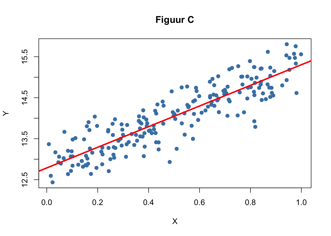 We zijn geïnteresseerd in de relatie tussen twee variabelen, X en Y. Bekijk de eerste drie spreidingsdiagrammen die hieronder zijn afgebeeld (A, B en C) en beantwoord de volgende vragen.