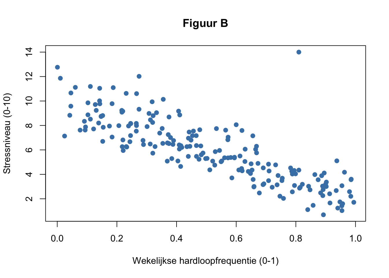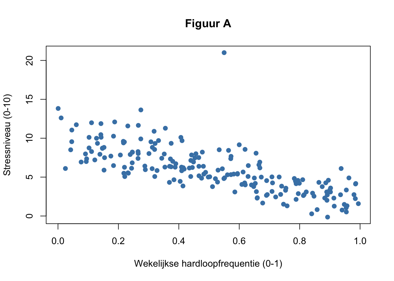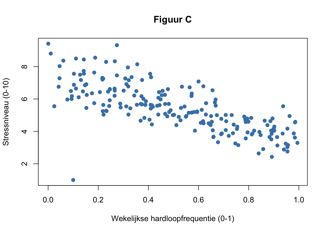 Spreidingsdiagrammen zijn niet alleen handig voor het waarnemen van de sterkte van associatie tussen twee variabelen, ze zijn ook erg geschikt voor het detecteren van uitbijters. In de figuren hieronder zijn drie verschillende spreidingsdiagrammen weergegeven tussen de wekelijkse hardloopfrequentie en het stressniveau: figuur A representeert 2018, figuur B 2019 en figuur C 2020.