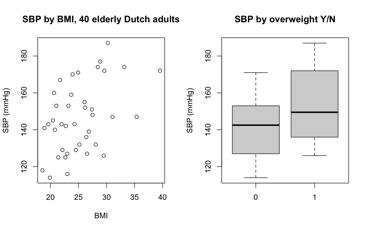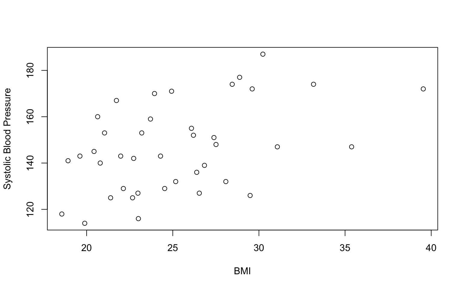 De gestelde onderzoeksvraag: Hebben mensen met een hoger gewicht, een hogere bloeddruk? Om dit te onderzoeken analyseren we de relatie tussen BMI (continue, numerieke variabele) en SBP (continue, numerieke variabele). In de afbeelding hieronder zijn de twee variabelen tegen elkaar uitgezet.