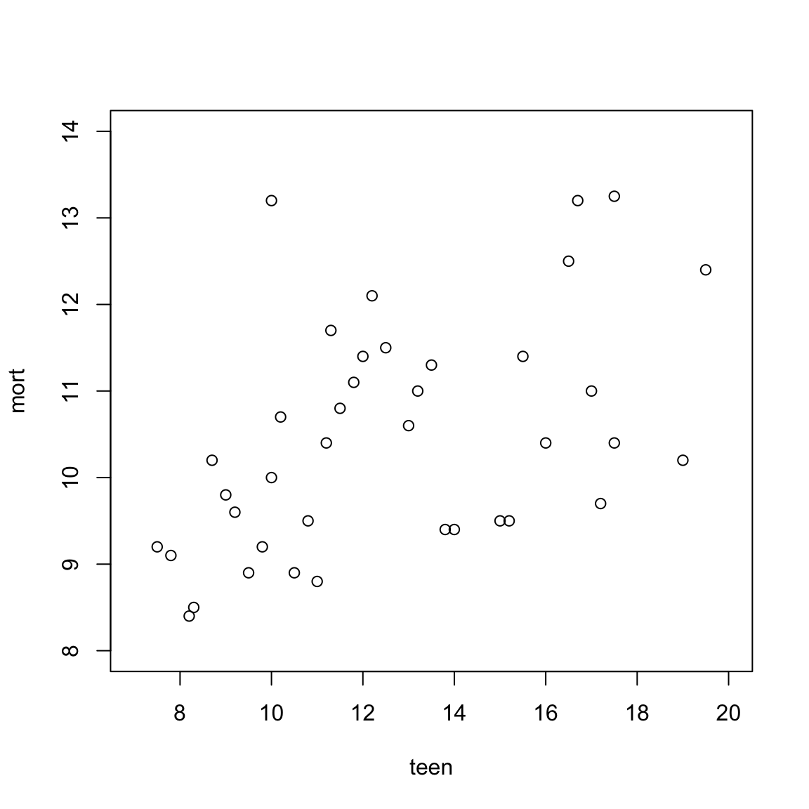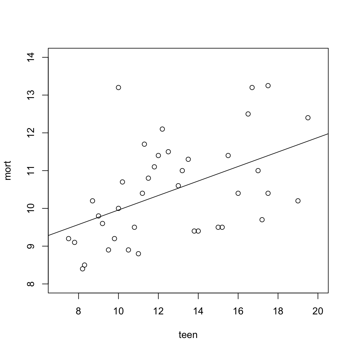 In onderstaand spreidingsdiagram is het aantal kindersterftegevallen per duizend levendgeborenen (mort) afgezet tegen het aantal baby’s van tienermoeders per duizend zwangerschappen (teen).
